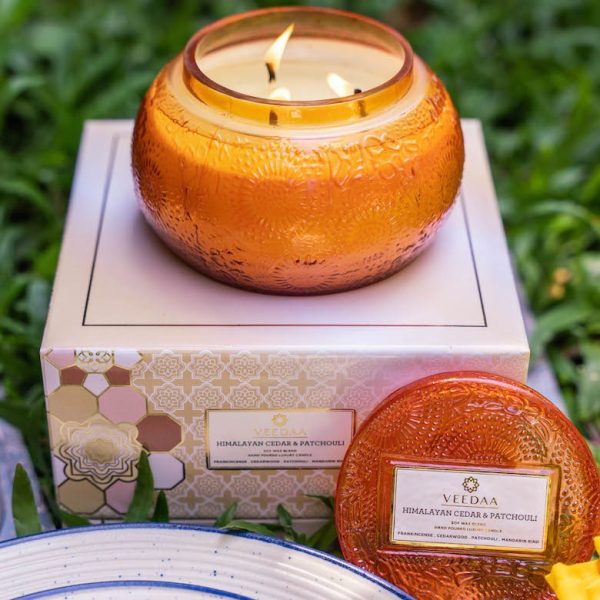 Our clean-burning soy wax blend is poured into this hand cut glass vessel along with a lid and an intricate design all over it. On burning, the candle creates a soft light from within. Rich colors adorn the packaging, which reflects a regal and contemporary mosaic design.